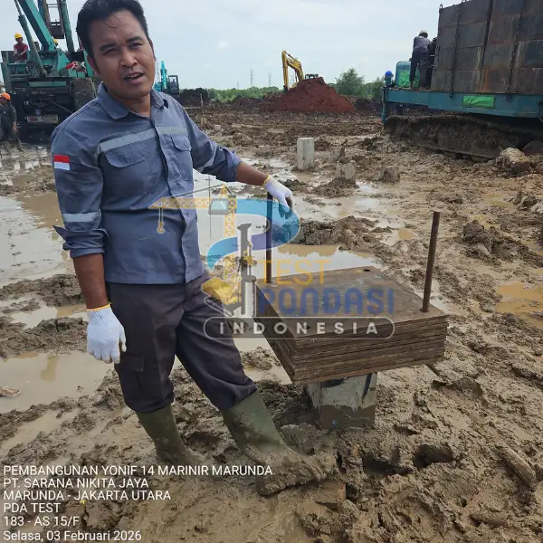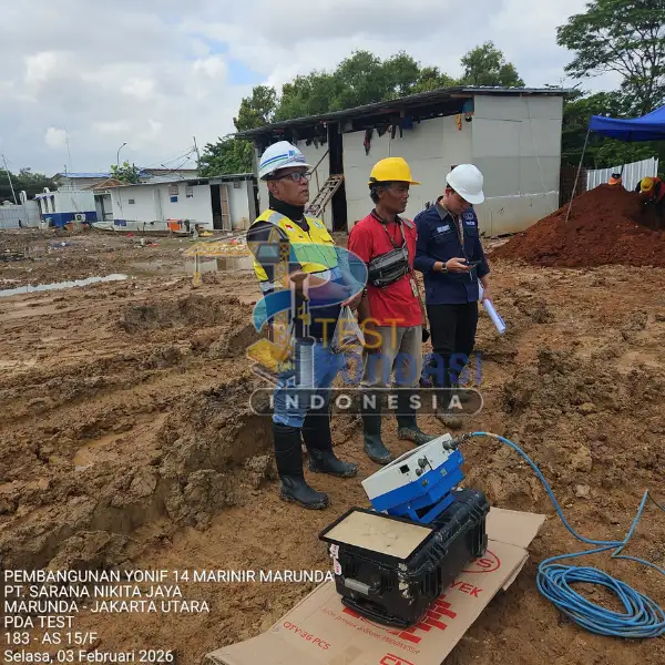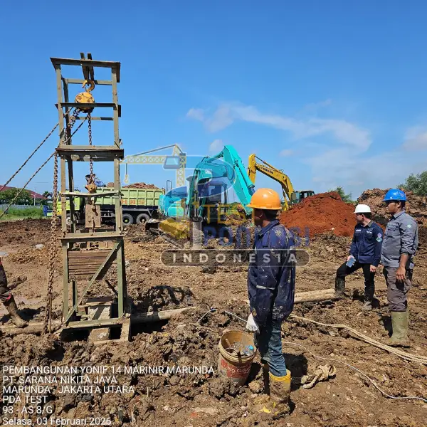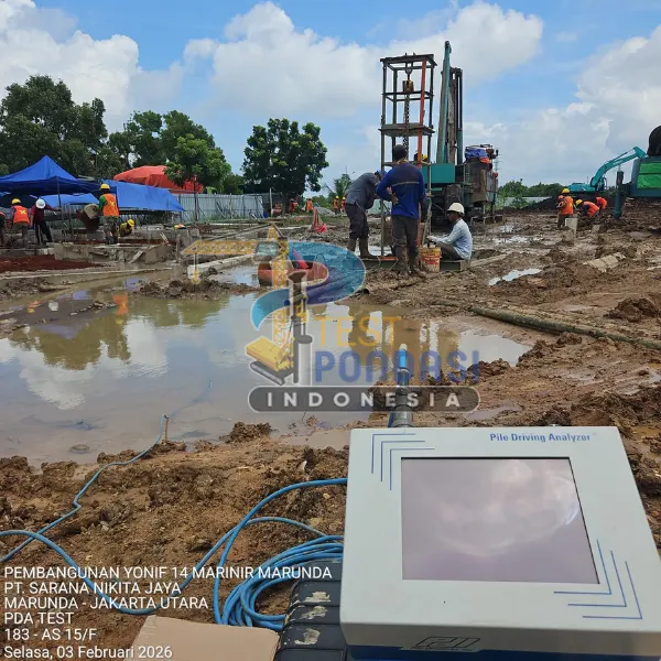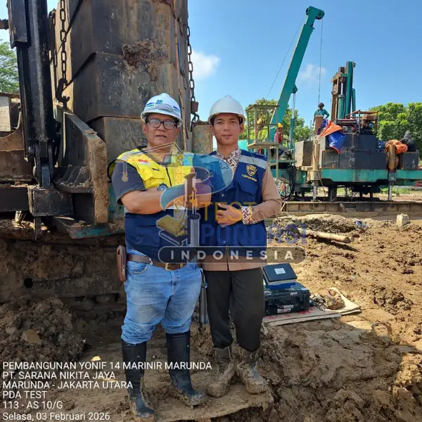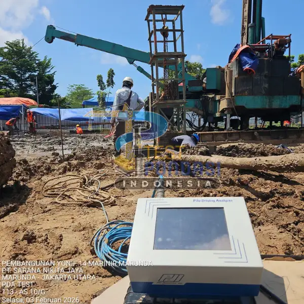 Study Case – PT. Sarana Nikita Jaya (Marunda – Jakarta Utara). Proyek pengujian pondasi ini menggunakan layanan PDA Test (Pile Driving Analyzer) yang dilaksanakan oleh Test Pondasi Indonesia untuk mendukung pembangunan Yonif 14 Marinir Marunda, dengan tujuan memastikan kinerja tiang pancang memenuhi persyaratan teknis dan keselamatan struktur.
